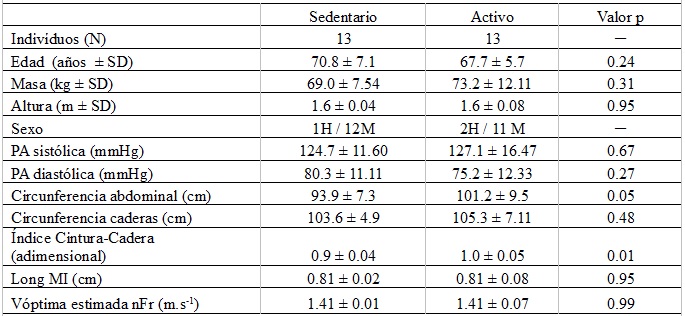 En la tabla 1 se presentan las características físicas de los dos grupos de participantes (13 en el grupo de los activos y 13 en el grupo de los sedentarios). Para todas las medidas no fueron encontradas diferencias estadísticamente significativas.