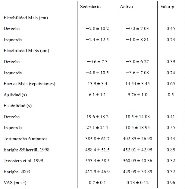 Para el grupo de activos las medidas de circunferencia abdominal y de índice cintura-cadera fueron mayores. No fueron encontradas diferencias para los tests funcionales y de marcha entre los dos grupos. Cuando se compara el test de marcha de seis minutos, intra grupo con las diferentes ecuaciones utilizadas fueron encontradas diferencias: para la ecuación de Enright & Sherrill, 1998 y Troosters et al., 1999 para los dos grupos; para la ecuación de Enright, 2003 para el grupo de sedentarios.