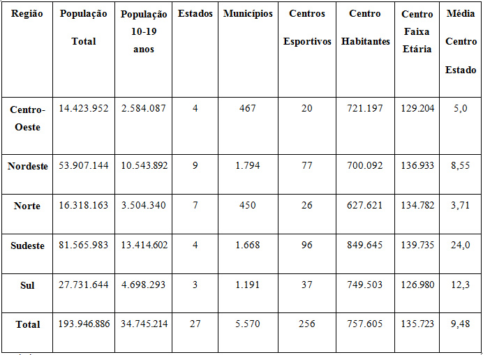 Outra analise que poderia ser feita a partir dos dados apresentados é relativa a população de jovens existentes no Brasil. Tendo em vista que quem frequentaria este espaço seriam indivíduos entre 10 a 19 anos, segmento que possui 34.745.214 milhões de habitantes, um centro teria que atender em média 135.723 mil indivíduos. Número alto para desenvolver políticas esportivas de qualidade. O valor se torna ainda mais preocupante pela centralização em algumas cidades, deixando com isso uma parcela significativa de jovens sem acesso a uma prática esportiva mais institucionalizada.