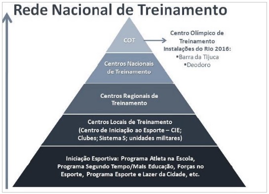 Nota-se que esta “Rede Nacional de Treinamento” trata-se de uma tentativa de mapear todas as instituições e agentes envolvidos no cenário esportivo brasileiro. Seria uma rede altamente capilarizada é que seria a responsável por acompanhar os jovens atletas até a chegada dos mesmos aos mais altos níveis competitivos.