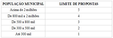 Já a quantidade de propostas a serem enviadas é definida em função da quantidade populacional dos municípios, conforme mostra a tabela a seguir: