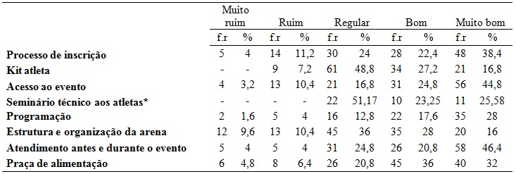 Quanto a satisfação para com a organização do evento, foram observados: o processo de inscrição, o “Kit atleta”, o Acesso ao evento, o Seminário técnico aos atletas, a Programação, a Estrutura e organização da arena, o Atendimento durante o festival e a Praça de alimentação, conforme melhor ilustrado na Tabela 4.