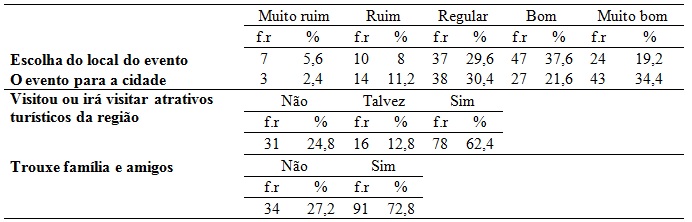 Para a satisfação da região quanto à vida cultural, ócio e natureza, foram observados os seguintes itens: escolha do local, a importância do evento para a cidade e se visitou ou irá visitar atrativos turísticos da região, conforme demonstrado na Tabela 5.
