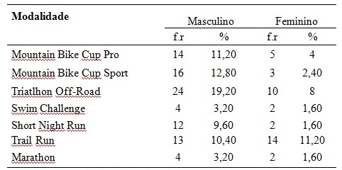 Podemos observar na Tabela 1 que a maior concentração de atletas está no Triatlhon Off-Road totalizando (27,2%) e os demais estão distribuídos nas outras modalidades, conforme discriminado.
