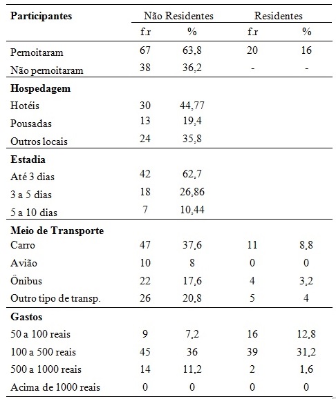 Os resultados sugerem dois tipos de participantes, os não residentes que são no total 105 atletas (84%) e os residentes 20 atletas (16%). Assim, em relação aos participantes não residentes que pernoitaram 67 (63,8%), observamos que se hospedaram em hotéis, pousadas e outros locais, sendo a estadia de até 3 dias (62,7%) a maioritária.
