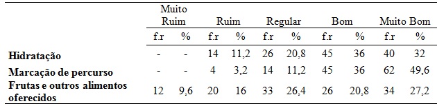 O percurso das modalidades esportivas foi avaliado positivamente por 85,6% de participantes. Quanto à hidratação durante as competições a sua avaliação foi entre o bom e muito bom, totalizando (68%) dos participantes. Em relação ao fornecimento de frutas e outros alimentos observamos que os valores são semelhantes entre o Ruim e Muito Bom, pelo que os organizadores devem tomar cuidado com este quesito para que se minimizem os pontos negativos.