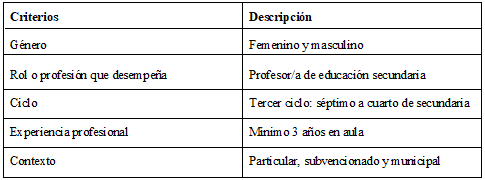El estudio se realizó con profesores de EF de la Provincia de Llanquihue, Región de los Lagos, de las tres dependencias educativas (municipales, subvencionadas y particulares). Participaron doce docentes, los cuales fueron seleccionados intencionalmente como parte de un estudio doctoral del autor. Al respecto, Gurdián (2010, p. 247) señala que, la selección apropiada de las y los sujetos actuantes, permite un mejor conocimiento del fenómeno por investigar. Esto garantiza una saturación efectiva y eficiente de las categorías con información de óptima calidad. En este contexto, se presenta a continuación los criterios de inclusión en la tabla 1.