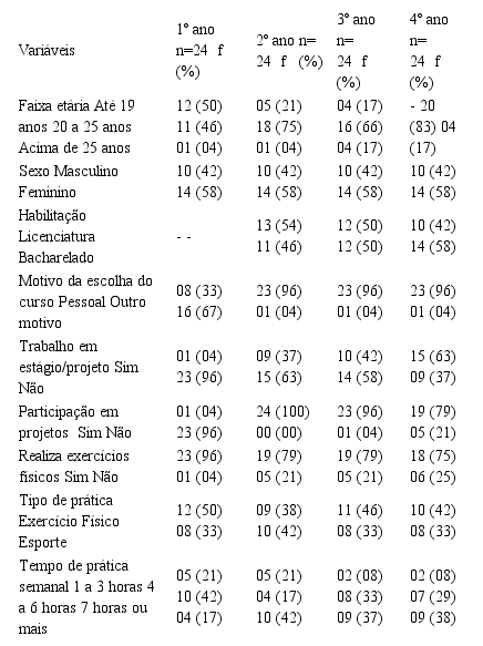 A Tabela 1 contêm os dados descritivos das características dos estudantes de Educação Física por meio de frequência e percentual. No primeiro ano somente um acadêmico realizava estágio como seu trabalho, mas a regulamentação do estágio de estudantes de Educação Física dessa universidade não permite a realização de estágio remunerado. Outro dado relevante é o fato de que todos os participantes desta pesquisa estavam inseridos em algum projeto (pesquisa, ensino ou extensão) quando estavam no segundo ano do curso.