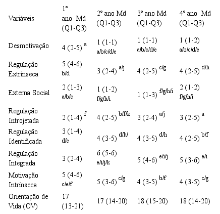 Verificou-se que os acadêmicos do 2º ano demonstraram menores níveis de motivação na regulação social (Md=1,0) e a desmotivação (Md=1,0), enquanto a maior mediana foi a da regulação integrada (Md= 6,0). Na comparação dos níveis de motivação dos acadêmicos do 3º ano (Tabela 2), verificou-se que as regulações se mantiveram iguais, as menores foram a regulação social (Md=1,0) e a desmotivação (Md= 1,0), já a maior foi a regulação integrada (Md=5,0). No 4º ano evidenciou-se que as menores medianas dos níveis de motivação continuaram entre a regulação social (Md=2,0) e a desmotivação (Md=1,0).