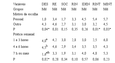 A Tabela 3 apresenta as comparações da motivação em função dos motivos de escolha do curso e tempo de prática semanal de exercício físico dos universitários do 1º ano do curso de Educação Física. Os resultados demonstraram que o nível de desmotivação foi maior quando a escolha do curso não se deu por motivo pessoal (Md= 4,3) assim como apresentou níveis de regulação integrada (Md=5,4) e motivação intrínseca (Md= 5,7) maior quando o motivo foi pessoal (Md=5,4).