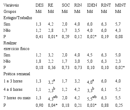 A Tabela 4 apresenta nas comparações em três grupos os acadêmicos do 2º ano com diferenças significativas. Os resultados revelaram que os acadêmicos ingressantes em estágio ou trabalho na área são mais motivados por regulação extrínseca (Md=4,2) e regulação identificada (Md= 6,0) em relação aos que não realizam ações na área. Na comparação entre os que realizam e os que não realizam prática de exercício físico, os acadêmicos apresentam maiores níveis de motivação intrínseca (Md=5,0) quando praticam exercício físico (p=0,02).