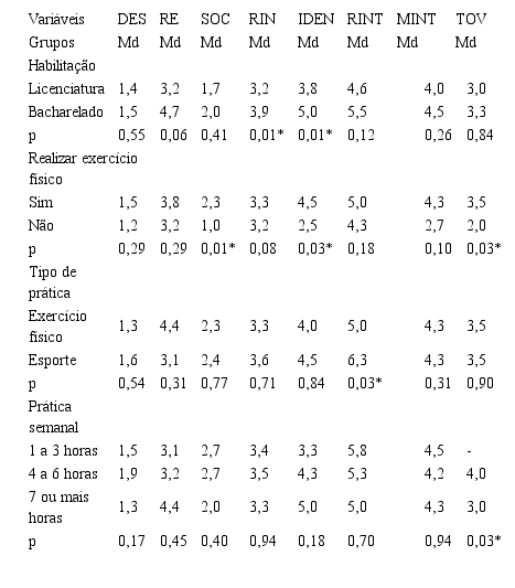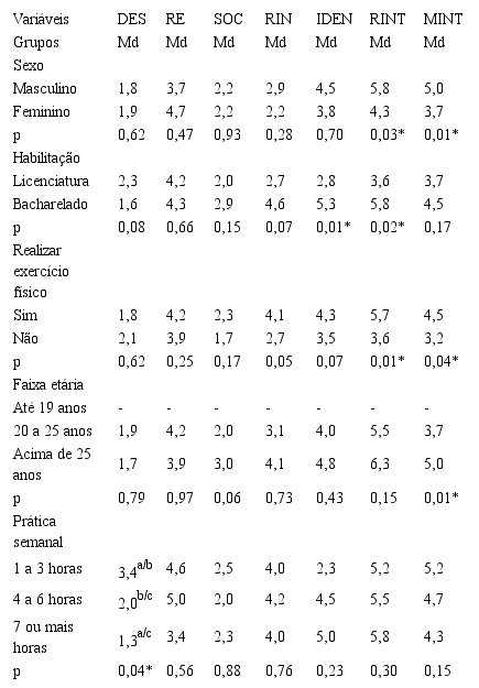 Os resultados (Tabela 6) referentes à comparação entre os acadêmicos praticantes de exercício físico e os não praticantes demonstraram maiores níveis de motivação por regulação integrada (Md=5,7) e motivação intrínseca (Md=4,5) para os que realizam exercício físico. Na comparação entre faixa etária, os acadêmicos inseridos acima de 25 anos se percebem mais motivados intrinsecamente (Md=5,0) em relação aos de 20 a 25 anos de idade (Md=3,7). Os resultados evidenciaram que quanto menos horas de prática de exercício físico os acadêmicos realizam mais desmotivados eles se percebem (p=0,04).