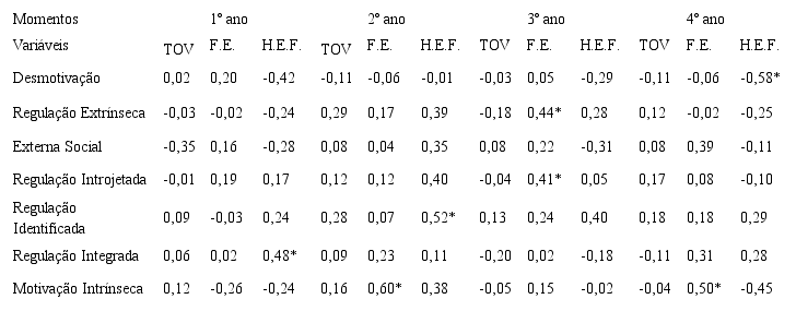 Em tratando-se de identificar o nível de motivação dos acadêmicos em cada ano de formação, verificou-se que para os acadêmicos, considerando os anos em uma análise transversal (Tabela 2), os níveis mais baixos de regulação extrínseca social e de desmotivação nos últimos três anos (2º, 3º e 4º) contrariam os resultados da pesquisa realizada com estudantes do curso de Educação Física, cujos resultados revelaram acadêmicos do terceiro ano com maiores níveis de desmotivação que os do primeiro, segundo e quarto anos (Spittle, Jackson & Casey, 2009).