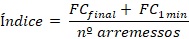 onde: FCfinal = frequência cardíaca registrada imediatamente após o final dos 3 blocos de teste, medida em bpm; FC1 min = frequência cardíaca registrada após 1 minuto depois dos três blocos de teste, medida em bpm; nº arremessos = número de arremessos executados ao longo dos 3 blocos.