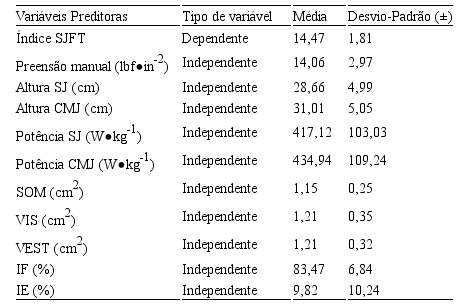 Os valores médios e seus respectivos desvios-padrão para as variáveis estudadas, tanto as independentes quanto a variável dependente, estão descritos na tabela 1. O valor médio do Índice do SJFT foi classificado como “Baixo”.