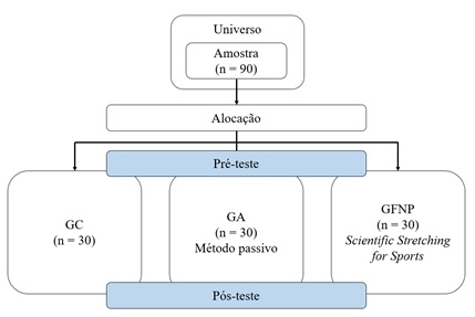 O experimento foi constituído de três grupos distintos e independentes (n = 30), que observaram dois estratos temporais, pré e pós, sendo os participantes distribuídos randomicamente para dois grupos experimentais: alongamento (GA) e facilitação neuromuscular proprioceptiva (GFNP), e um controle (GC) (figura 1).