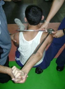 Na FHO o indivíduo ficou em posição sentada com as pernas estendidas, mantendo uma postura reta, com a cabeça voltada para frente e ombros simétricos. O braço direito manteve-se abduzido em um ângulo de 90º com o tronco, o cotovelo estendido com a palma da mão voltada para baixo. Logo após, o goniômetro foi posicionado com o seu eixo central sobre o ponto acromial. Uma das hastes manteve-se fixa nas costas do aluno no sentido transversal, ao longo de uma linha traçada entre os pontos acromiais direito e esquerdo e a outra sustentada na face externa do braço, sobre a linha traçada entre os pontos acromial e radial. Após a adoção desse posicionamento, o avaliado executou a FHO com exigência máxima, como ilustra a figura 2.