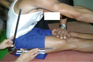 A FCL foi realizada com o aluno sentado mantendo as pernas estendidas em um ângulo de 90º com o tronco e braços soltos ao lado desse. O eixo central do goniômetro foi posicionado sobre o ponto trocantérico, com uma das hastes fixada na lateral do tronco, sobre o prolongamento da linha axilar, e a outra ao longo da parte lateral da coxa. Em seguida, executou-se o movimento, como aponta a figura 4.