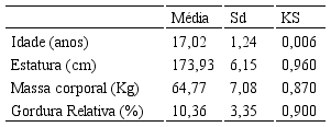 Os resultados denotam que não existem diferenças significativas (p<0,05) entre os valores médios, para as variáveis: estatura, massa corporal e gordura relativa, o que permite afirmar que não há diferenciação antropométrica entre os participantes.