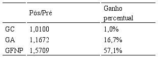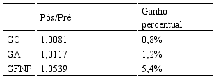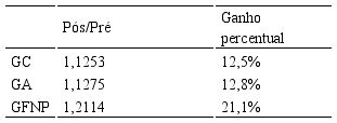 Como o cálculo refere-se a razão entre o pós e o pré-teste, índice de razão, os resultados apontam que os ganhos observados pelo grupo que realizou a FNP foram significativamente superiores (5,4%) (p= 0,001) aos ganhos observados pelo grupo que realizou alongamento (1,2%) que, por sua vez, apresentaram-se superiores aos do grupo controle (0,8%).