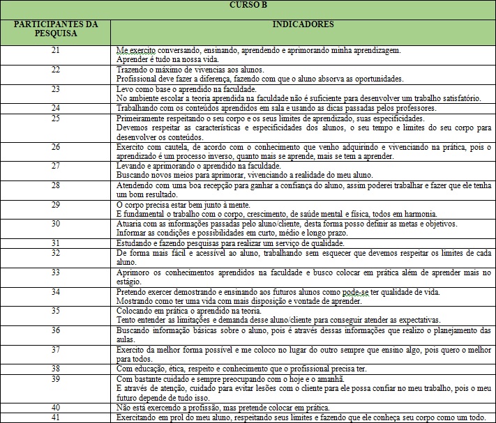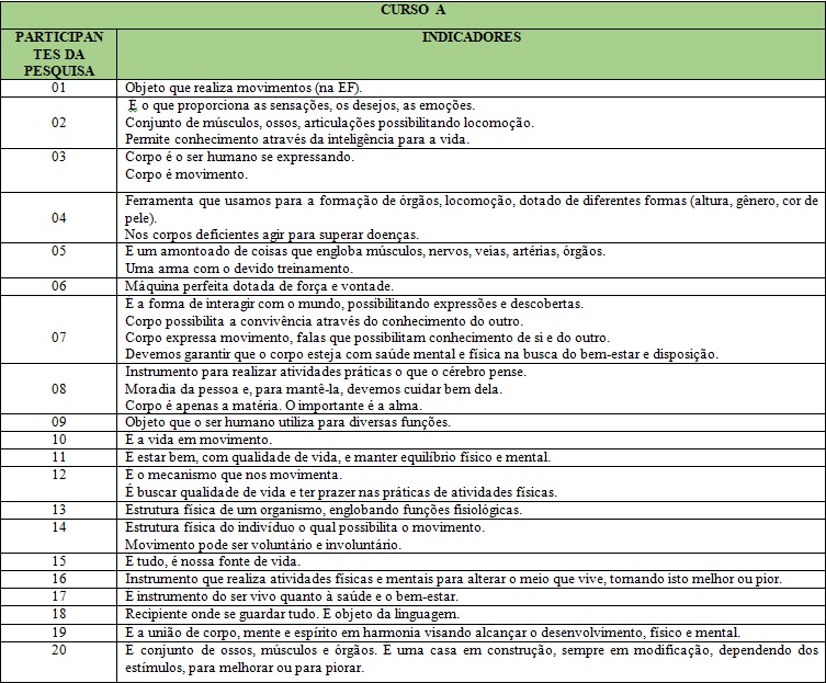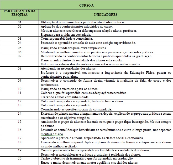 Buscamos, junto à análise ideográfica de Moreira, Simões e Porto (2005), mostrar “(...) as idéias dos sujeitos individualmente (...)” (p. 110) por meio de um levantamento dos indicadores, que foi realizado com base nas respostas dos concluintes dos Cursos de Licenciatura em Educação Física A e B. O Quadro 1 descreve estes indicadores.