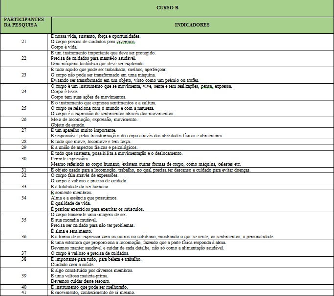 Na análise ideográfica dos indicadores da Pergunta 1 (“O que é corpo/corporeidade para você?”) tivemos doze participantes que demostraram uma preocupação com o cuidado com o corpo, sendo eles: participantes 05, 07, 08, 11, 21, 22, 31, 32, 35, 37, 38 e 39. A respeito dessas respostas, Gonçalves-Silva, Souza, Simões e Moreira (2016) advertem: