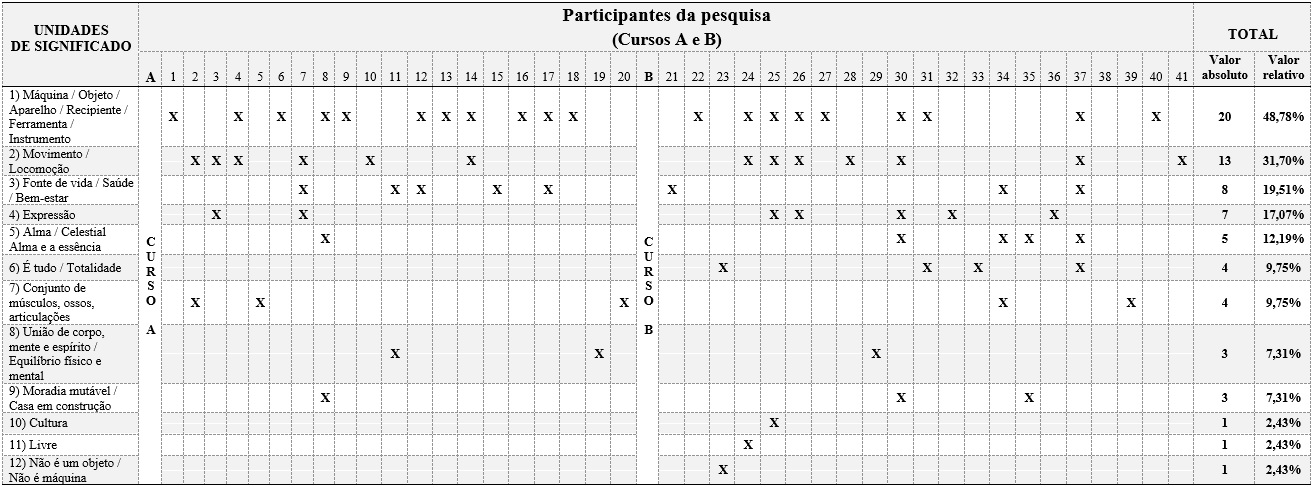 Na análise das respostas da pergunta “O que é corpo/corporeidade para você?” foram identificadas 12 Unidades de Significado (US), como pode ser observado na Tabela 1.