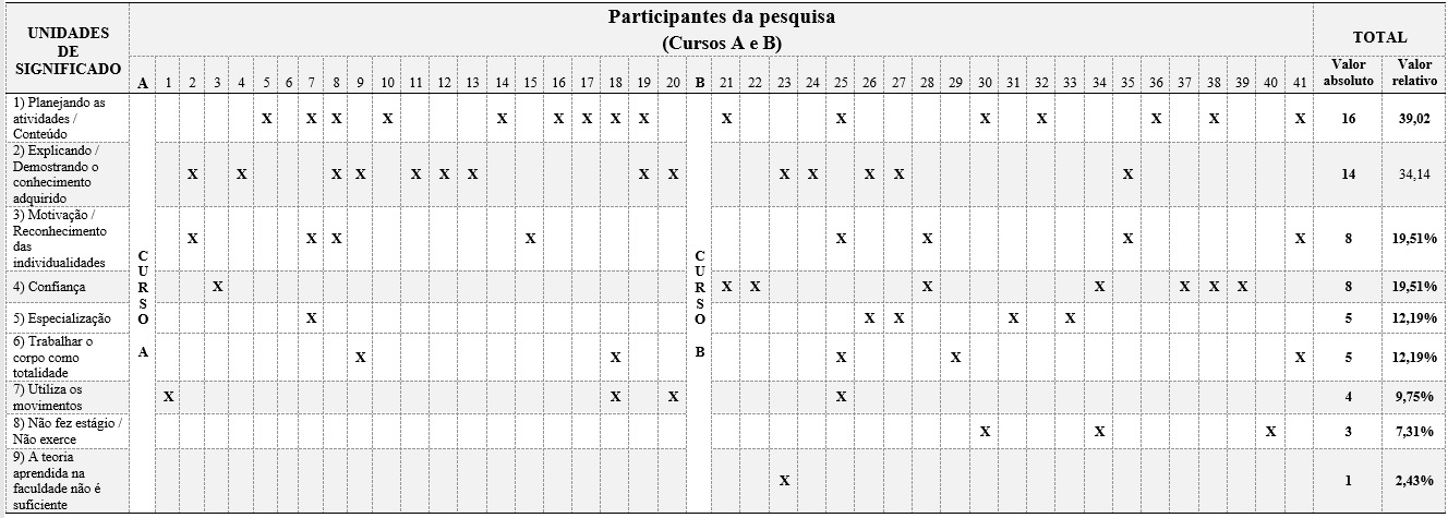 A análise realizada foi embasada no referencial contido no artigo Análise de conteúdo: técnica de elaboração e análise de unidades de significado (Moreira, Simões & Porto, 2005), que busca identificar, nas respostas dos sujeitos participantes, os significados que estes elaboram para a vivência de um determinado fenômeno. Em nosso caso, a proposta se dirige aos discursos dos alunos concluintes dos cursos de licenciatura em Educação Física.