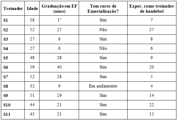 A média de idade dos treinadores entrevistados foi de 43,0 (± 10,8) anos (mín=27, máx=59), graduados há uma média de 19,5 (± 12,1) anos (mín=1, máx=38) e com tempo médio de experiência como treinador escolar (específico no handebol) de 12,5 (± 7,7) anos (mín=4, máx=27). Todos os entrevistados possuíam formação em nível Superior em Educação Física, sendo que oito são Pós-graduados (lato sensu), dois não participaram e um estava com um curso dessa natureza em andamento.