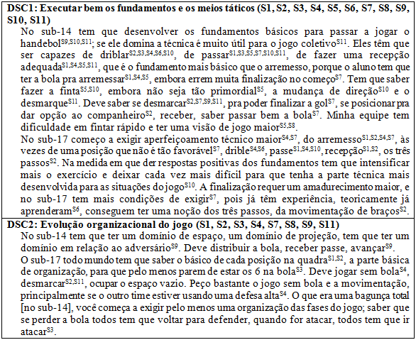 Considerando o desenvolvimento dos aspectos tático-técnicos individuais, o DSC1 apresenta de maneira pragmática a necessidade de executar bem o conjunto de técnicas específicas do handebol, ao passo que no DSC2 emerge a ideia de uma evolução organizacional do jogo ao longo das categorias sub-14 e sub-17.