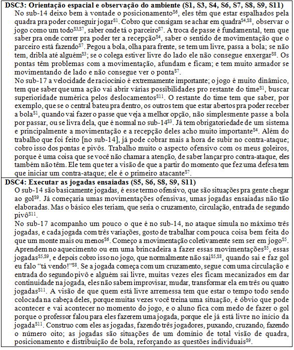 Conteúdos coletivos (Quadro 3): DSC3 (proveniente da IC-3: “Orientação espacial e observação do ambiente”, opinião compartilhada por oito treinadores) e DSC4 (decorrente da IC-4: “Executar jogadas ensaiadas”, opinião compartilhada por cinco treinadores).
