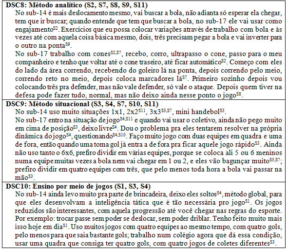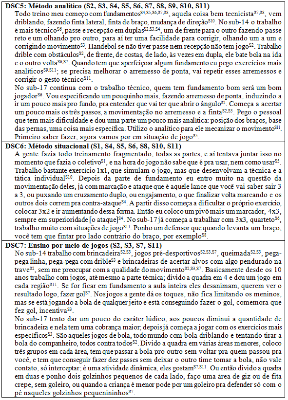 Quando a temática se referiu aos métodos de ensino adotados pelos treinadores, foi possível elaborar os DSC inerentes aos conteúdos individuais (Quadro 4) e coletivos (Quadro 5) em ambas as categorias.