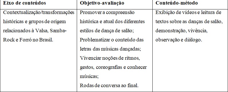 As aulas foram planejadas de modo a garantir o trato de conceitos teórico-práticos sobre o surgimento e consolidação dos estilos no Brasil, bem como a experimentação dos passos e apreensão do ritmo individual e em duplas. O final de cada aula foi reservado para os participantes expressarem suas compreensões e percepções sobre as questões de gênero e sexualidade. O Quadro 1 apresenta uma síntese da organização didática sem seus pares objetivo-avaliação e conteúdo-método.