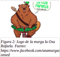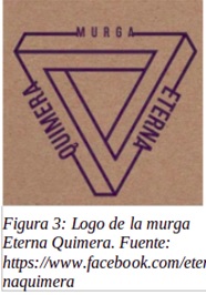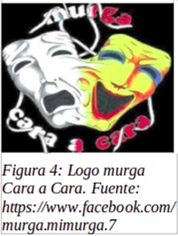 De esta manera, a lo largo del proceso de investigación, se pudo observar en las distintas sedes de los clubes, el arraigo que tienen las murgas en los elementos cotidianos que afectan a la mito-praxis5 (Sahlins, 1985): a) en la figura 3 vemos el logo de la Eterna Quimera, que ensaya en el club Peñarolde San Carlos, donde el arquero es el que toca los platillos de la batería de murga, uno de los dirigentes del club es uno de los cantantes activos de la murga, la presencia del cantinero trabajando desde antes del ensayo, con un trabajo silencioso preparado el mate , la grapa y algo para cenar para los que vienen directo de la práctica de fútbol a ensayar. b) El club de fútbol Colón y la murga los Fantasmas se divierten, cuya música suena en cada salida a la cancha o en cada grito de gol con su himno al club - murguero y su distintivo logo - presente en la figura 1 - aparece en las banderas, en las camiseta de los planteles de fútbol, y en todos los espacios que tenga el logo del club, se identifican con el barro Martín Vidal por medio del logo; c) el club San Carlos es uno de lo más representativos de la ciudad, destacándose a nivel interdepartamental y nacional por sus resultados y representación, ya que compiten en campeonato OFI6 y la murga que “sale de ahí7” denominada Cara a Cara - figura 4 -, en la cual participan familiares de los futbolistas. El logo de la murga está ubicado al lado del escudo del club en la sede. d) En la década de los noventa nace, en el club Ituzaingó de Punta del Este, la murga la Osa Rafaela - logo en la figura 2. En sus inicios fue denominada la Murga Verde (color característico de este club). La cual unos años más tarde se muda a la sede delclub Atlético Neptunode San Carlos, en Avenida Rocha 581, desde donde sale, el logo es parte de los equipos deportivos y de competencia de los planteles juveniles del club.