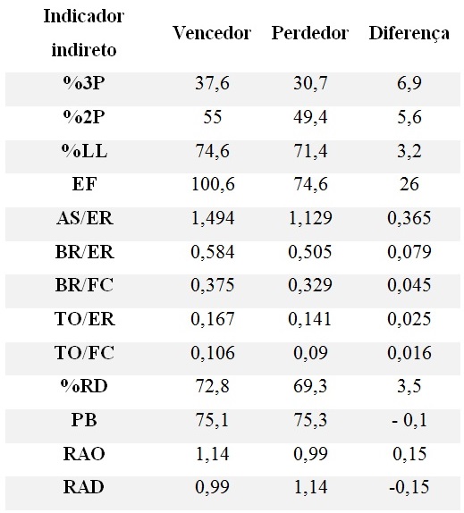 Os indicadores indiretos são obtidos a partir de fórmulas matemáticas que se utilizam dos diretos, somando-se a estes para compreensão dos acontecimentos e padrões de jogo, relativizando alguns números absolutos e contextualizando melhor algumas ações (Kubatko etAl., 2007; Sampaio, Lago & Drinkwater, 2010; Malarranha, 2011; Enge, 2018; Pivotanalysis, 2019; Nbastuffer, 2020; Araújo, 2020). Porcentagem de arremesso (%3P, %2P, %LL) indica o quanto uma equipe acerta seus arremessos. Eficiência (EF) demonstra quão assertiva é uma equipe em relação ao que é negativa. Assistências por erros (AS/ER) indica se a equipe é cuidadosa com a bola. Bolas recuperadas ou tocos por erros (BR/ER, TO/ER) indica se a equipe tem competência defensiva para compensar os erros ofensivos, impedindo a finalização adversária. Bolas recuperadas ou tocos por faltas cometidas (BR/FC, TO/FC) indica se a equipe tem uma defesa agressiva, mas ao mesmo tempo cuidadosa, ou seja, indica se a equipe tem aplicação defensiva qualitativa. Porcentagem de rebotes defensivos (%RD) diz respeito à competência da equipe para conquista de rebotes defensivos, não apenas levando em conta os conquistados, mas sim o total de possíveis. Posses de bola (PB), indicador de jogo também chamado de pace, indica o ritmo de jogo da equipe. Quanto mais posses, mais arremessos faz e, consequentemente, mais vezes tem a posse de bola. Razão/proporção ofensiva (RAO) e defensiva (RAD) significa quantos pontos, respectivamente, a equipe faz e sofre a cada posse de bola, tendo 100 posses como valor de referência. Por, em sua maioria, tratarem de dados relativos ou percentuais, faz sentido contabilizar apenas as médias.