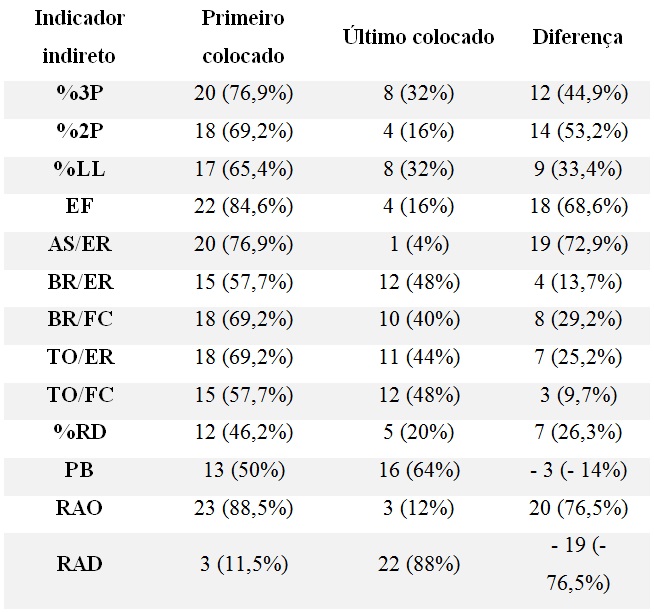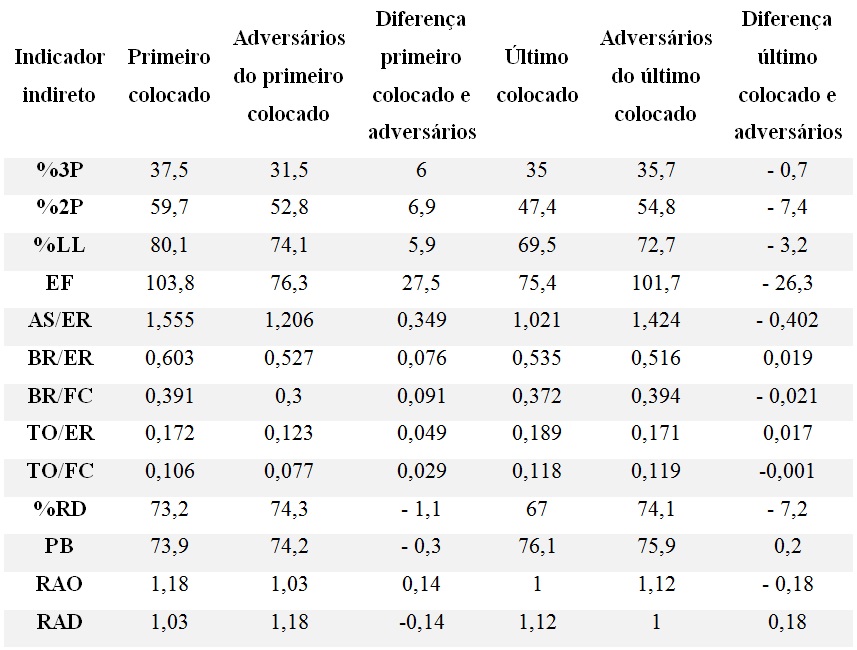 A superioridade em posses de bola (PB) confirma a ideia de que o perdedor de cada partida é menos cuidadoso em relação à seleção de seus arremessos. Corrobora para esse dado, ainda, a superioridade do vencedor de cada partida em percentual de acerto de arremessos (%3P, %2P, %LL), principalmente no caso dos 3 pontos (%3P). A razão defensiva (RAD) é um indicador negativo, significando, no caso em tela, que o perdedor de cada partida sofre mais pontos a cada 100 posses de bola do vencedor. Uma boa eficiência (EF), ou seja, uma maior competência geral nas ações positivas e maior cuidado com as negativas mostra-se importante para vitória em cada partida, assim como a relação entre assistências e erros (AS/ER). Somadas ao percentual de arremessos (%3P, %2P, %LL), indicam que equipes que cuidam bem da posse de bola e selecionam seus arremessos com calma e qualidade, têm boas condições de vencer cada partida. Canan, Mendes e Silva (2015) encontraram resultados semelhantes em relação à eficiência (EF). Malarranha (2011), estudando o campeonato mundial, identificou superioridade do vencedor e inferioridade do perdedor na razão ofensiva (RAO) e defensiva (RAD), respectivamente. Não foram encontrados estudos que tenham comparado vencedores e perdedores de cada partida ou colocações em competições, em relação a outros indicadores indiretos (ver Tabela 10).