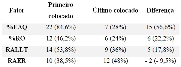 A razão ofensiva (RAO) mostra-se como indicador com maior diferença entre primeiro e último colocados na fase de classificação da competição. Importante apontar que as 23 vezes em que o primeiro colocado na fase de classificação foi superior aos seus adversários foram justamente nas vitórias de equipe (esse dado não consta na Tabela 12, mas foi também coletado). Relação entre assistências e erros (AS/ER) e eficiência (EF), novamente apresentam-se como indicadores que indicam alta possibilidade de primeira colocação na fase de classificação da competição. Canan, Mendes e Silva (2015) identificaram que o primeiro colocado na fase de classificação foi superior em eficiência (EF) aos seus adversários em 100% dos casos.