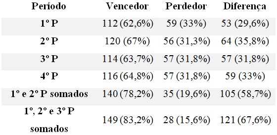 É possível perceber que as equipes vencedoras e perdedoras de cada partida fazem o maior número de pontos no quarto período (4º P) e menor no segundo período (2º P). Em termos de diferença, o período que se apresenta mais importante para vitória na partida, se considerado individualmente, é o segundo (2º P). Contudo, terminar o segundo período (1º e 2º P somados) à frente e, principalmente, terminar o terceiro período (1º, 2º e 3º P somados) à frente no placar mostra-se como um fator mais importante do que vencer qualquer período individualmente (ver Tabela 02).