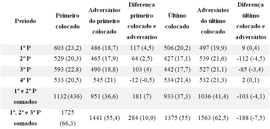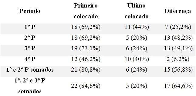 No caso do último colocado, o período mais vezes perdido foi o segundo (2º P), seguido de perto pelo terceiro (3º P). Porém, terminar o terceiro (1º, 2º e 3º P somados) e o segundo período (1º e 2º P somados) atrás no placar mostraram-se dados mais importantes para ser último colocado na fase de classificação. A diferença entre as equipes na quantidade de vezes que cada uma terminou o terceiro período (1º, 2º e 3º P somados) à frente do placar ressalta a importância desse indicador para que uma equipe seja primeira ou última colocada na competição. Ferreira e Barreto (2017) identificaram resultado semelhante, enquanto Canan, Mendes e Silva (2015) identificaram que terminar o segundo período à frente (1º e 2º P somados) é mais importante do que terminar o terceiro (1º, 2º e 3º P somados) à frente.
