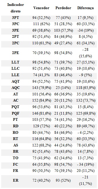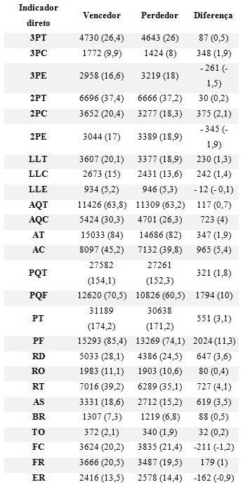 Justamente nos indicadores negativos é que o perdedor de cada partida foi superior ao vencedor. Em todos os demais indicadores, o vencedor foi superior, com destaque para o total de pontos feitos (PF) e total de pontos de quadra feitos (PQF). Em segundo plano, destaque para arremessos de quadra totais (AQT) e convertidos (AQC) e rebotes totais RT), este único indicador de destaque não relacionado à pontuação. Resultados semelhantes foram identificados por Csataljay et al. (2009), em estudo ao campeonato europeu, Dias Neto (2007), em relação ao campeonato mundial, Almas (2015) em edição anterior do NBB e Canan, Mendes e Silva (2015) (ver Tabela 06).
