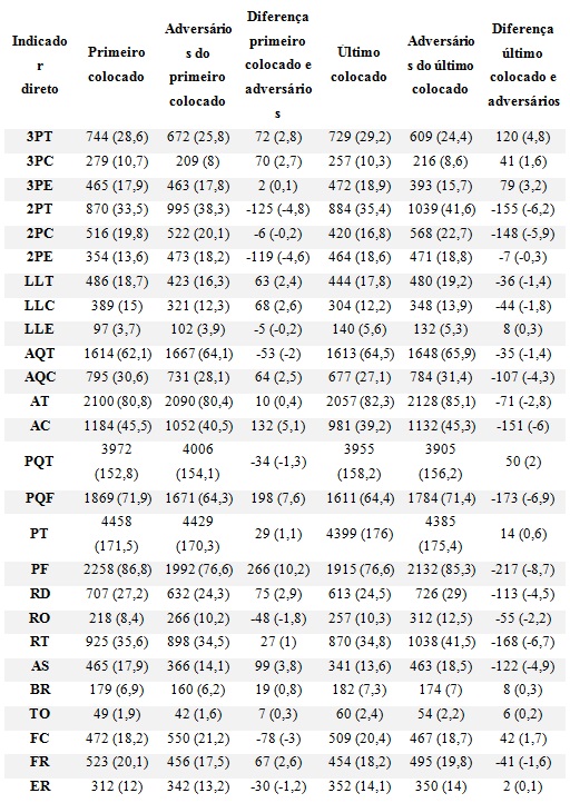 O primeiro colocado da competição tentou, acertou e errou menos arremessos de 2 pontos (2PT, 2PC, 2PE) que seus adversários. Contudo, a diferença entre os arremessos de 2 pontos certos (2PC) foi bastante menor que de tentados (2PT) e errados (2PE), o que significa que o primeiro colocado da fase de classificação selecionou melhor seus arremessos de 2 pontos, aumentando as condições de acerto. Também tentou menos arremessos (AQT) e pontos de quadra (PQT), errou menos lances livres (LLE), cometeu menos faltas (FC), teve menos desperdícios de bola (ER) e pegou menos rebotes ofensivos (RO). Assim como o vencedor de cada partida, o primeiro colocado na fase de classificação, por errar menos arremessos que os adversários, teve menos oportunidades de conquistar rebotes ofensivos (RO). As assistências (AS) demonstraram-se um importante indicador para primeira colocação na fase de classificação, corroborando o encontrado por Prochnow et al., (2017), além de Dias Neto (2007) e Canan, Mendes e Silva (2015).