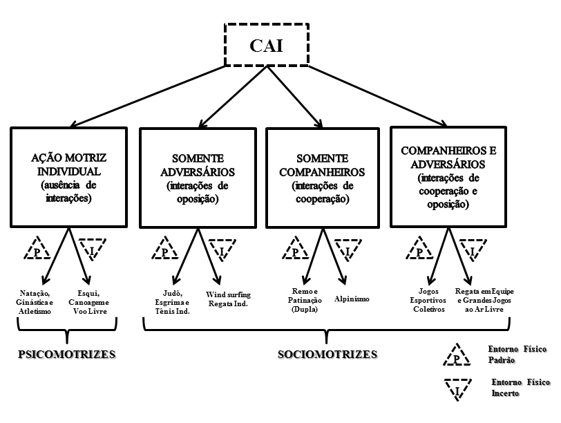 A partir dos conhecimentos da Praxiologia Motriz, tal matriz teórica propõe uma classificação para os jogos e esportes, onde as práticas motrizes estão classificadas a partir dos pilares da lógica interna. Os Universais e o Sistema de Classificação CAI (Companheiro, Adversário, Incerteza), que são pautados na concepção que os indivíduos, participantes do sistema praxiológico, estabelecem interações com o entorno físico e com os outros possíveis participantes (Parlebas, 2001; Lagardera & Lavega, 2003). Os praticantes do sistema motriz podem ter ou não a presença de companheiros e/ou adversários, e o espaço de ação pode ser incerto ou padrão (Parlebas, 2001; Lagardera & Lavega, 2003). Sabe-se que, o entorno físico é caracterizado pela instabilidade ou a padronização do local, no qual, a prática motriz irá ser realizada.
