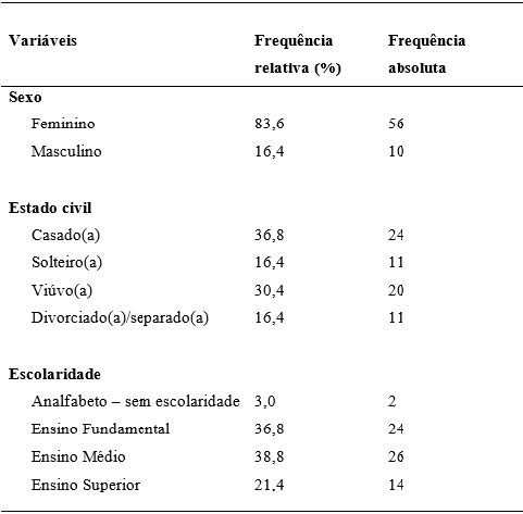 Apresenta-se na tabela 1 os dados sociodemográficos dos 66 indivíduos participantes desse estudo. Nessa, percebeu-se a maior ocorrência de mulheres idosas; quanto ao estado civil, a grande maioria é casada, seguido de viuvez e o ensino médio, seguido do ensino fundamental detém o predomínio quanto ao nível de escolaridade.
