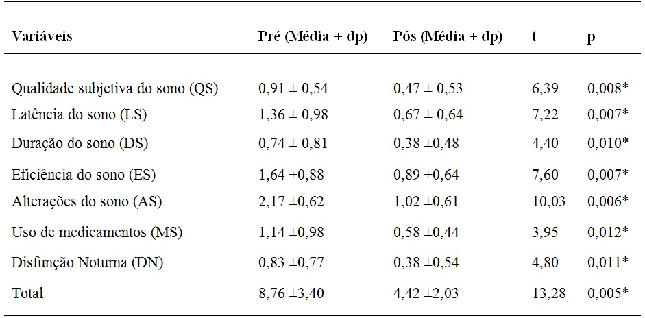 Na tabela 2 apresenta-se os dados descritivos de média e desvio padrão relativos às 7 categorias do Questionário Índice de Qualidade do Sono de Pittsburg (PSQI). Encontra-se também as diferenças estatisticamente significativas entre as 7 variáveis, após a intervenção das 26 sessões apontando para a eficiência da combinação do MPS e TCC na percepção de melhoria da qualidade do sono.