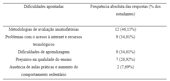 A análise de conteúdo das respostas dos 26 estudantes permitiu a categorização das respostas em cinco fatores, que correspondem às principais dificuldades apontadas pelos estudantes no ensino-aprendizagem de Educação Física, durante a pandemia da COVID-19, com a aplicação do modelo remoto de ensino e uso das tecnologias para viabilizá-lo (Tabela 1).