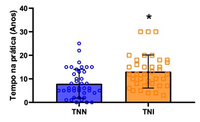Iniciamos por apresentar a caracterização dos TNN e TNI, o que já evidencia alguns diferenciais: TNI apresentaram maior média de anos de experiência prática (13 anos) em relação aos TNN (8 anos): conforme expressa a Figura 1: