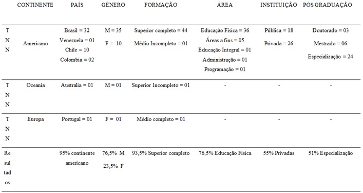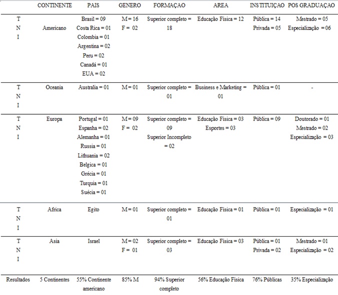 O continente americano predominou na amostra do estudo. Isto aconteceu em decorrência do pesquisador principal ser do continente e ter maior acesso a estes treinadores, já que ministrou várias oficinas e participou de competições continentais em alguns países deste continente. O continente asiático se mostrou com baixo número de treinadores, já que países como China e Japão, potências na modalidade, não participaram do estudo e poderiam contribuir ainda mais para os resultados; as ausências se justificam pela dificuldade em encontrar respondentes com conhecimento da língua inglesa e pela China especificamente, não ter acesso aos arquivos da plataforma Google. No entanto, vale destacar que pesquisas envolvendo treinadores de 5 continentes não são frequentes, o que demonstra uma rica amostragem para apresentação final deste estudo.