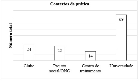 A Figura 1 apresenta os contextos de prática em que os(as) alunos(as) relataram ter experiência em comissões técnicas esportivas. Vinte e oito alunos(as) tiveram experiência em dois ou mais contextos de prática, por isso, o resultado reporta a frequência absoluta de alunos(as) que declaram experiência no contexto. A maioria (n = 69, 53,50%) dos(as) alunos(as) declararam experiência no contexto universitário.