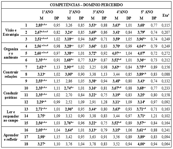 Fonte: Elaboração própriaDiferente da importância atribuída, observamos diferenças acerca do domínio percebido sobre todas as competências entre alunos(as) de diferentes anos (Tabela 5). Houve diferença significativa entre os(as) alunos(as) do 1º e 2º ano no domínio sobre as competências de visão e estratégias e organizar o ambiente. Na comparação entre alunos(as) dos primeiros anos com os de 3º, 4º e 5º houve diferença significativa sobre o domínio das competências de definir visão e estratégia (questão 3), organizar ambientes (questões 4, 5 e 6), conduzir práticas (questão 10), ler e responder ao campo (questões 13 e 15), e aprender e refletir (questão 16).
