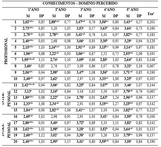 Não constatamos diferenças significativas sobre a importância atribuída aos conhecimentos entre alunos(as) do 1º ao 5º ano (Tabela 2). Entretanto, constatamos diferenças significativas sobre o domínio percebido acerca de todos os conhecimentos entre os(as) alunos(as) de diferentes anos, principalmente os de 1º e 2º ano comparados aos de 3º, 4º e 5º ano (Tabela 3).